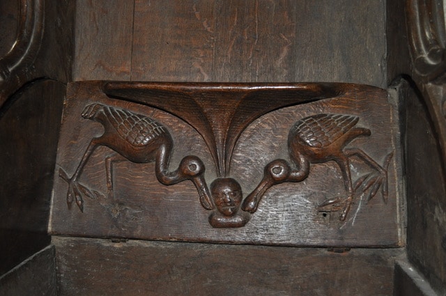 Spoonbills have been loitering around our Suffolk coasts each summer for years, particularly in secluded places like Havergate Island, and they seem poised to become the next local colonist. Or in this case a re-colonist. Spoonbills were common in Britain in the middle ages, when there was even a colony by the Thames at Fulham. And there’s a fascinating wooden carving on the misericords in Lavenham church, featuring a spoonbill (on the right) pecking at some unfortunate man. The bird on the left is also usually described a spoonbill, but I’m not so sure. The ‘spoon’ seems to be concave in this case and looks more like the man’s ear; moreover, if you look at the bird’s tail, which seems to be carefully depicted in the form of a drooping bustle of feathers, I wonder if this second bird could instead be another charismatic species once common in the Fens and now also making a come-back, a crane? Cranes have nested at Wicken Fen this year, so they are getting closer. Whatever next? Dalmatian pelicans once nested in the Fens, too …